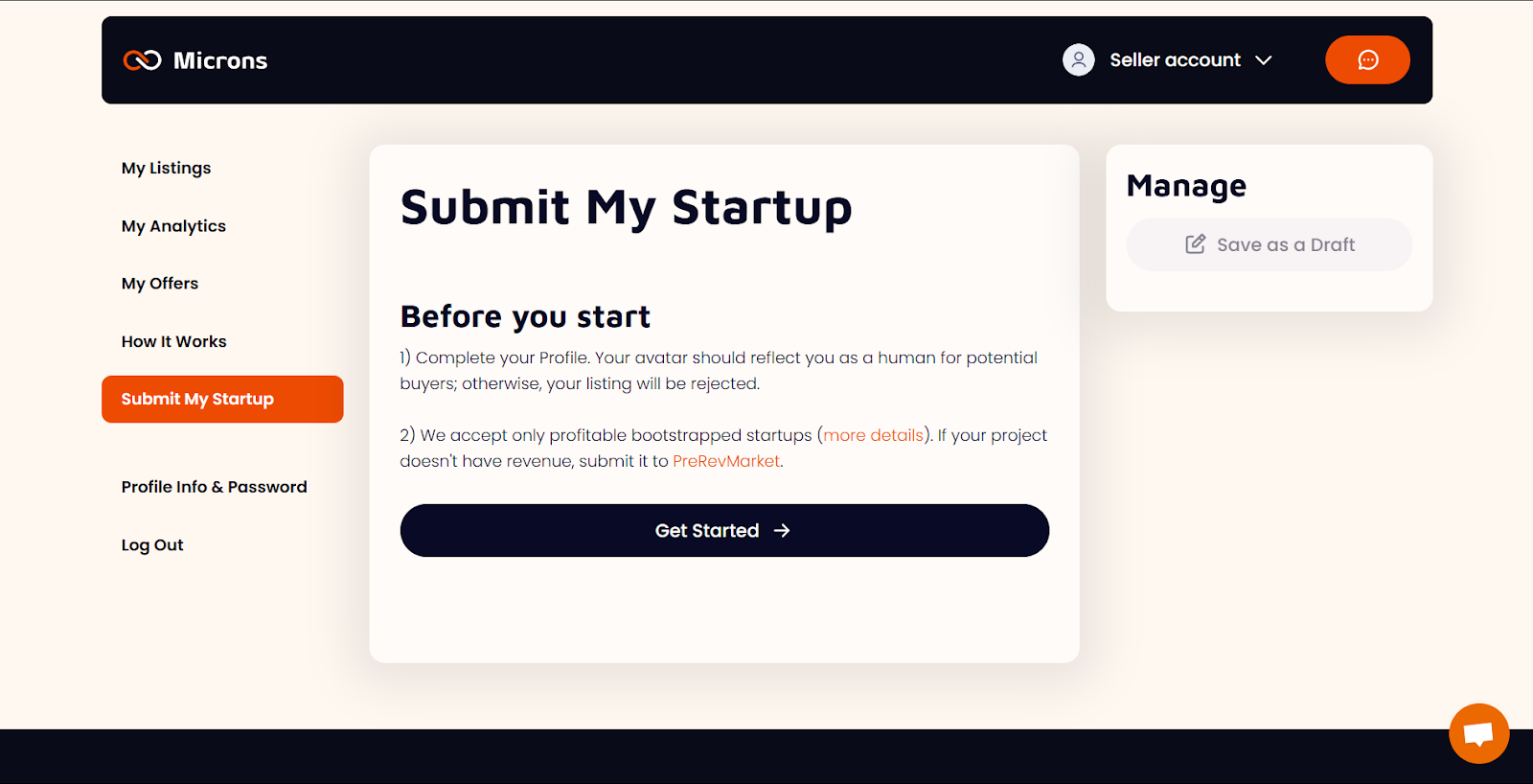 Afterwards, click the ‘Get Started’ button to begin filling out the form with the details of the business you’re putting up for sale. The “What does your startup do?” question requires a one-sentence answer. You’ll have the opportunity to describe your business in more detail in subsequent sections.