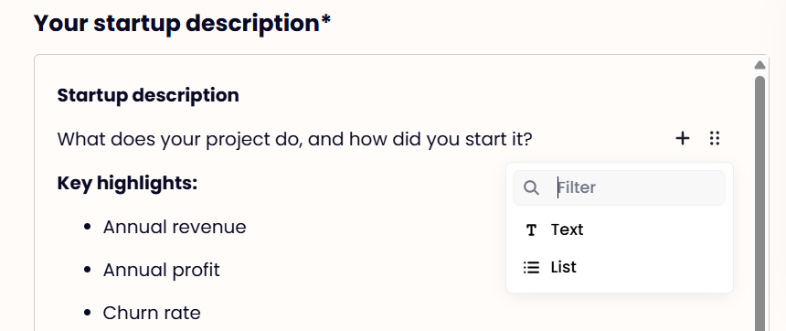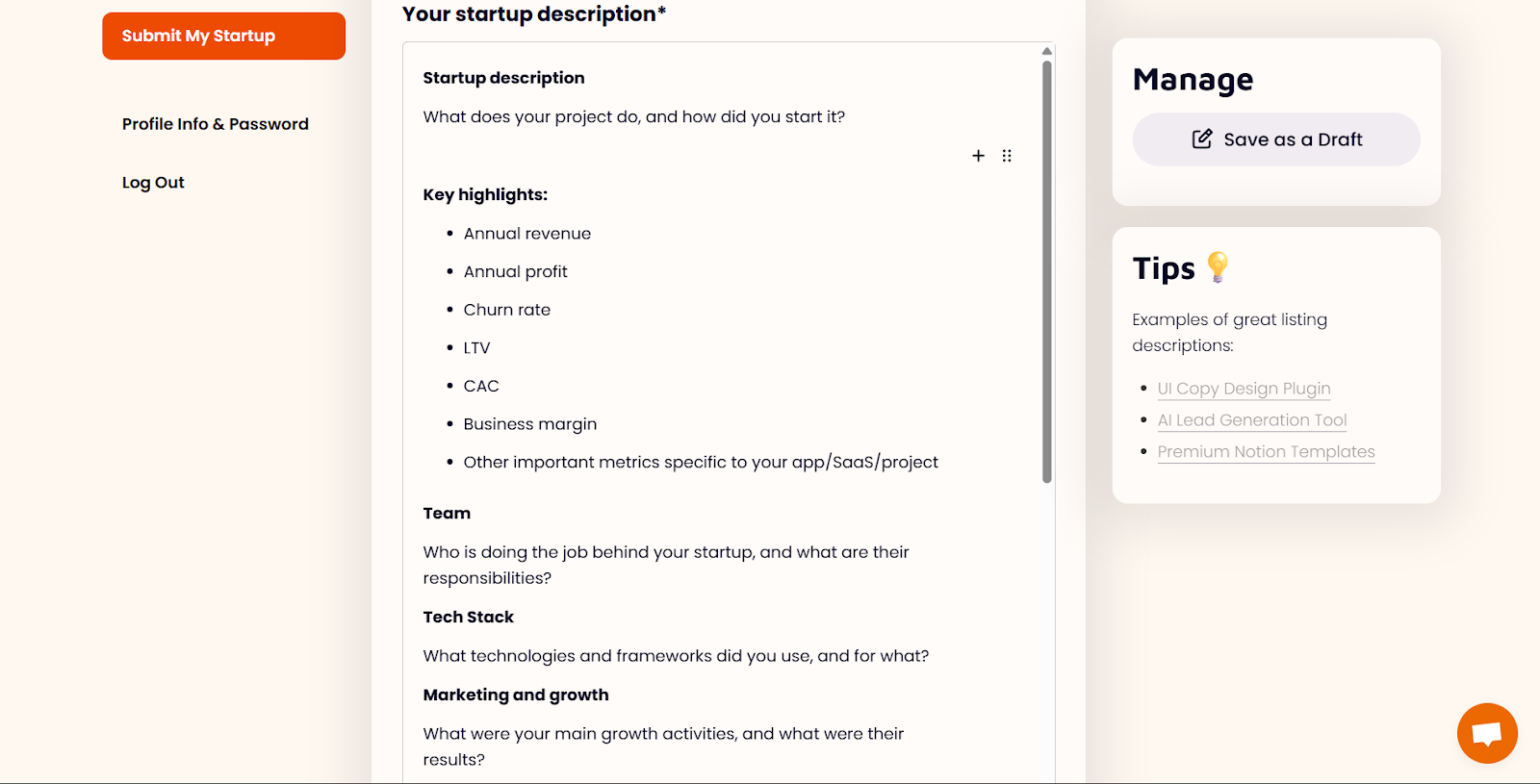 The Startup description lets you give details about your business, the product(s) you sell, problems your business solves, and who it serves. We advise you to follow the template provided, as it’s been designed to help you create a properly structured, winning listing.