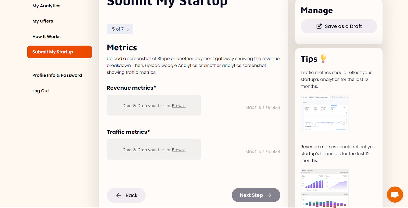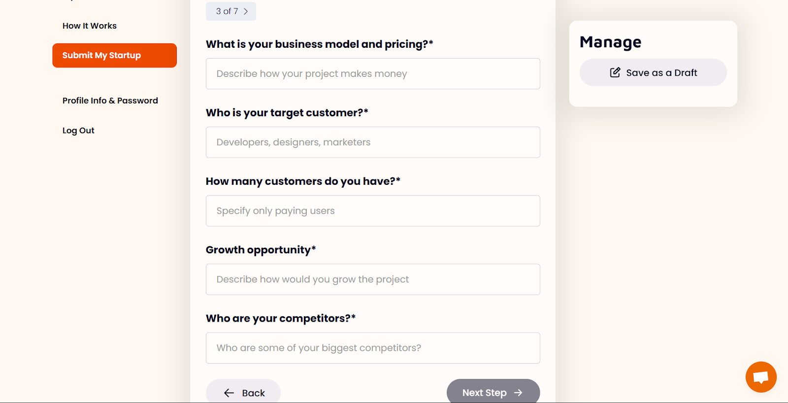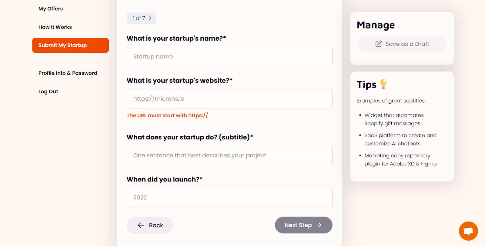 Once you’ve completed your profile, click the 'Submit My Startup’ button on your dashboard to begin creating your first listing.