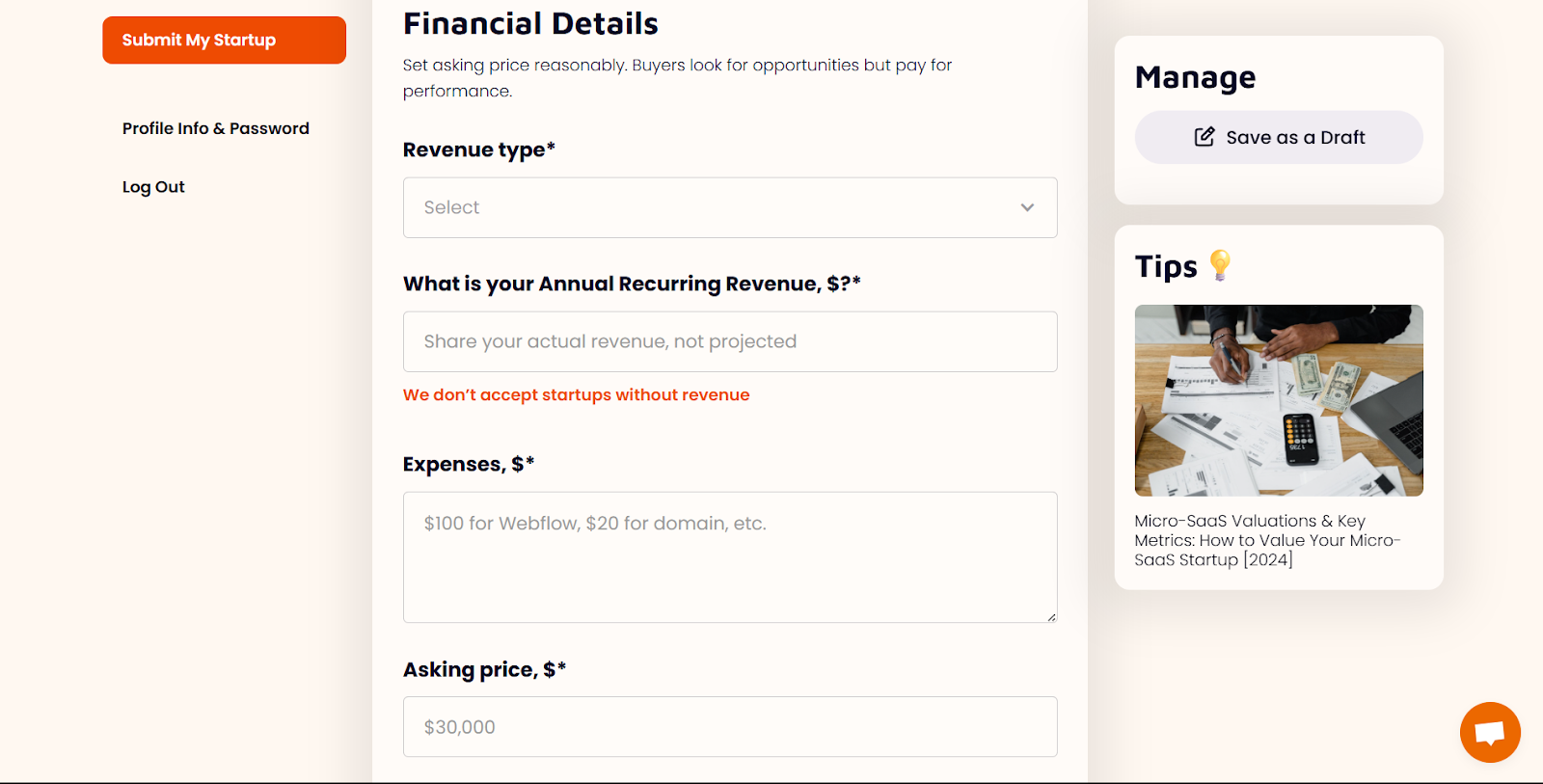 In the previous section, you listed your business and pricing models. Now it’s time to tell potential buyers your revenue model: whether it’s a monthly subscription or a one-time payment. You’ll be required to input your annual recurring revenue, expenses and asking price, all in USD. If your revenue is in other currencies like euros or pounds, etc., convert it to USD, including your asking price.