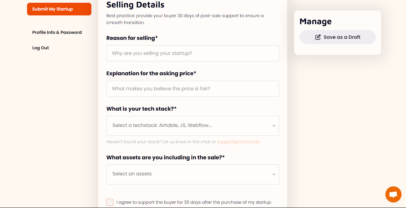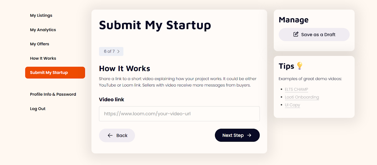 Now is the time to put a face to the startup and show potential buyers why they should buy your project. You can record either a YouTube or Loom video, explaining your motivation for starting the project, what problem it solves, how it works, the unique selling point, and why you’re selling, etc. Typically, give a demo of the project. Don’t just shoot a video, tell a story. You can then personalize the content by telling potential buyers to contact you on Microns.