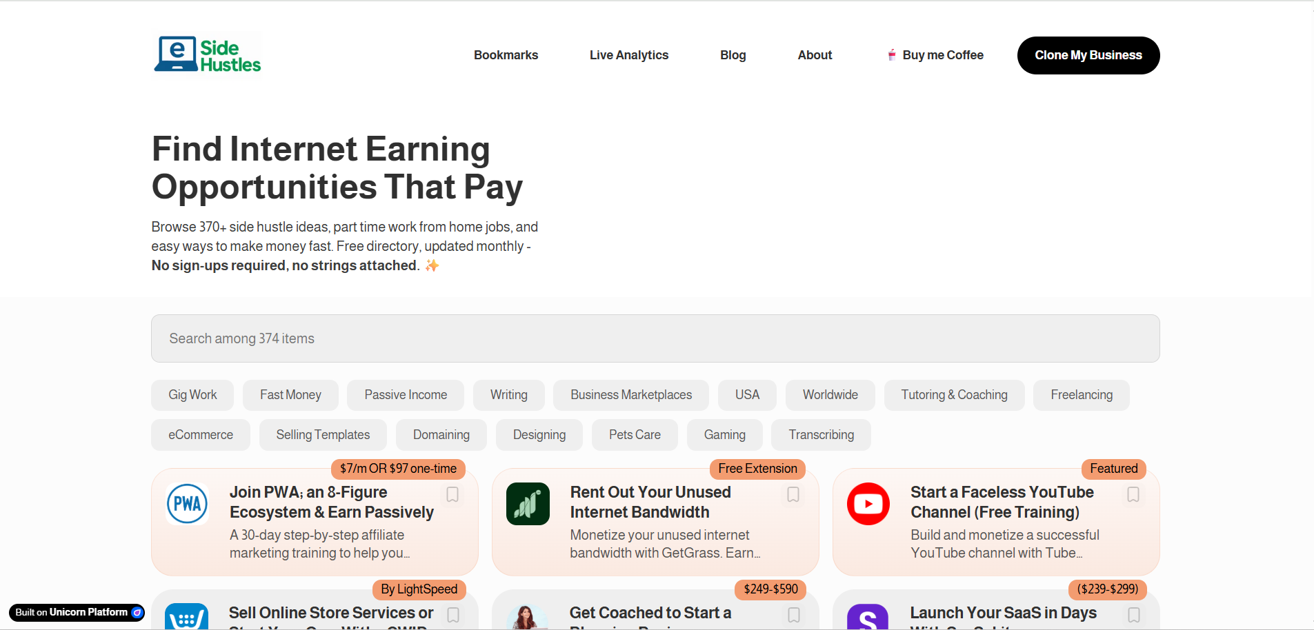 <p><b>Startup Description</b></p><p>My product is like a personal assistant, finding the best income resources and internet side hustle ideas.</p><p>I know the feeling of desperately searching the web for the right websites to make money online, side hustle ideas, or just easy ways to earn money.</p><p>That's why I created my directory. It filters out the shitty resources and opportunities so you only get the best ones that are proven to work and generate real money.</p><p>In short, it's like a personal assistant finding the best income resources and e-side hustle ideas across the web to help you leave no room for guessing and focus only on what can make you real money.</p><p>This directory is curated by me personally. I'm a serial internet solopreneur with an 8 successful exits record, so you know you’re getting top-notch information and making the most use of your valuable time and hard-earned money.</p><p><b>Key highlights:<b></b></b></p><ul><li>Very competitive yet rewarding niche</li><li>$500 revenue generated already</li><li>Huge growth potential</li><li>25 published blog posts</li><li>Growing backlink profile and domain authority (Just hit 27)</li><li>Proven history of interest</li><li>The directory is the only one that curates that number of resources and ideas</li><li>Traffic reached $31K pageviews in a matter of months</li><li>Over 11,000 individuals have visited the site since launch, according to GA</li></ul><p><b>Team</b></p><p>Just me. Doesn't require a team or any special effort to maintain.</p><p><b>Tech Stack</b></p><p><b>Unicorn Platform</b>: A website creation platform made specifically for directory-style websites by an entrepreneur called John Rush (King of directories).</p><p><b>Marketing and growth - </b><b>If I were to keep the site, I would focus on the following:</b></p><ul><li>Focus more on SEO</li><li>Increase digital marketing and utilize TT + YT</li><li>Roll out a mobile app</li><li>Integrate site-wide ads - Currently, a single pop-up ad only</li><li>Focus more on Reddit</li><li>Increase efforts on Medium and X</li><li>Publish more content - Currently 25 articles published</li><li>List more resources and side hustle ideas - Currently 374</li></ul><p><b>Revenue and profit</b></p><p>To date, the site has generated well ~ $500 in revenue from affiliate commissions, sponsors, and a single pop-up ad.</p><ul><li>~$40 TinyAdz</li><li>~$250+ Grass</li><li>~$100+ sponsors</li><li>$59 SEOMODE submission service</li><li>$49 PWA affiliate program</li></ul><p><b>Startup assets<b></b></b></p><ul><li>Website and everything it contains</li><li>Domain (27 rating score exact match domain)</li><li>Intellectual property</li><li>Copyright of the entire site, brand name, and 25 blog posts</li><li>Codebase/entire Unicorn Platform account access</li><li>Marketing materials</li><li>Google Search Console</li><li>Google Analytics</li></ul><p><b>Risks</b></p><p>There's literally no risk involved. With a quick search on Google, you can see that there's no single website that offers the same quality or concept on the entire web. There's one, but it only curates like 60-70 resources, not even close in user experience, resources, reviews, quality, and perceived value.</p><p><b>Reason for Selling</b></p><ul><li>Lack of time</li><li>Starting a new venture</li><li>Financial gain</li></ul></br>✅ $500 in Annual Revenue✅ 10,000 customers✅ Business model: Sponsorship+Affiliate✅ Built with Unicorn, Google Analytics