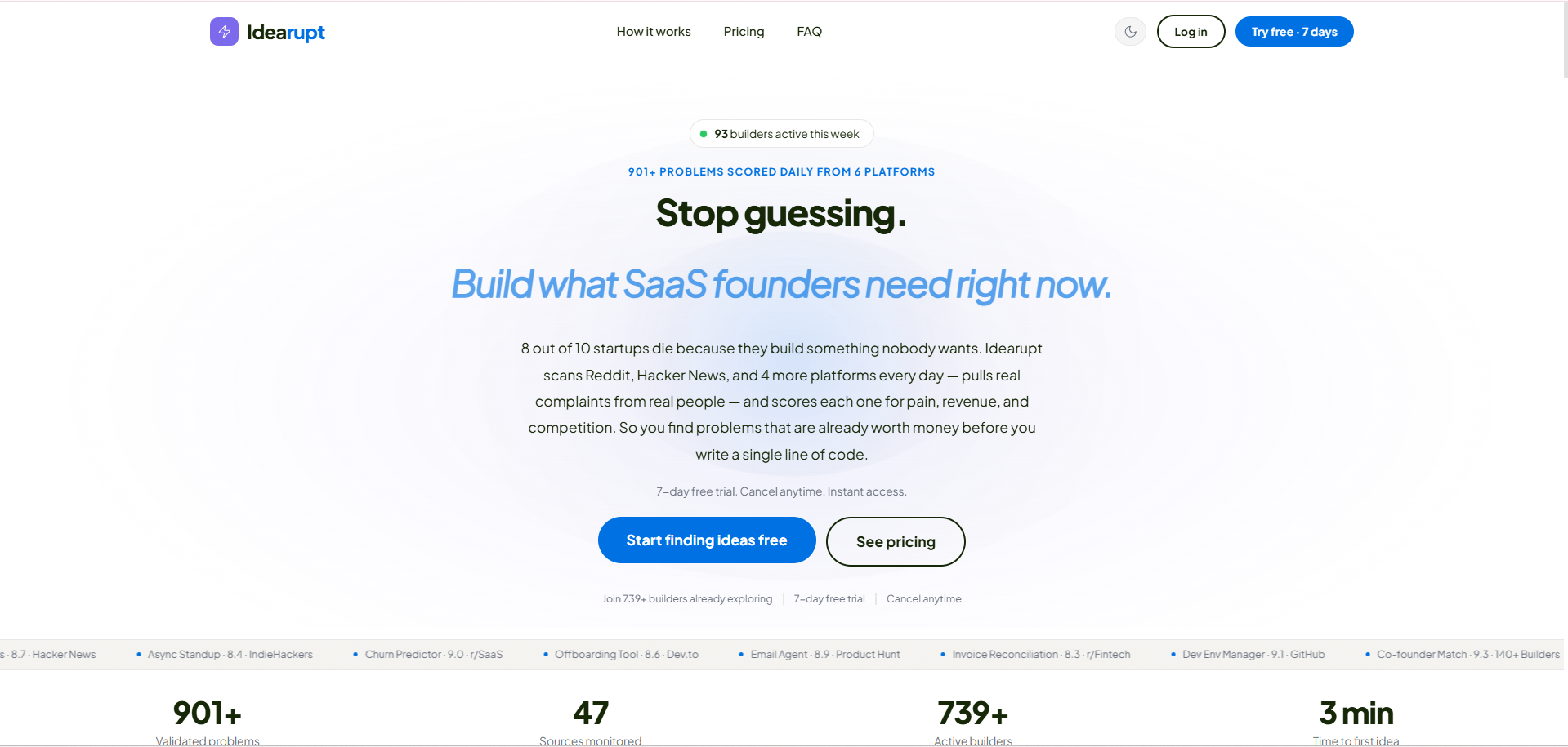 <p><b>Startup description</b></p><p>The idea came from my own observation: I watched too many founders waste months building products nobody actually wanted.</p><p>I come from the cold calling world. I ran a virtual call center agency for the last 3 years, doing $1.5M+ in lifetime revenue, and the one pattern I saw on repeat was builders shipping with zero evidence anyone wanted the thing. Shower thoughts turning into 6 months of wasted code.</p><p>My tool scrapes Reddit and Hacker News daily, pulls real user complaints and pain points, scores each one across 10 dimensions (market size, urgency, willingness to pay, competition, execution difficulty, etc), and generates a full business blueprint the buyer can execute. no guessing. no hoping. real problems, scored, ranked, ready to build against.</p><p>I launched publicly in February 2026 and hit 1,100+ users by April 20, 2026. That's under 2.5 months, 100% organic, zero ad spend.</p><p><b>Key highlights:</b></p><ul>